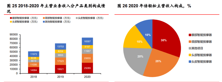 2019-2020年,公司主营产品眼部、颈部、头皮部及头部智能便携按摩器的销售总量同比由 115.5万台增长至139.78万台,年均复合增长率为21.1%;2020年的毛利率分别为54.06%、 66.66%、64.18%及65.63%,分别占公司当年总营收30.35%、25.03%、14.51%和9.92%。