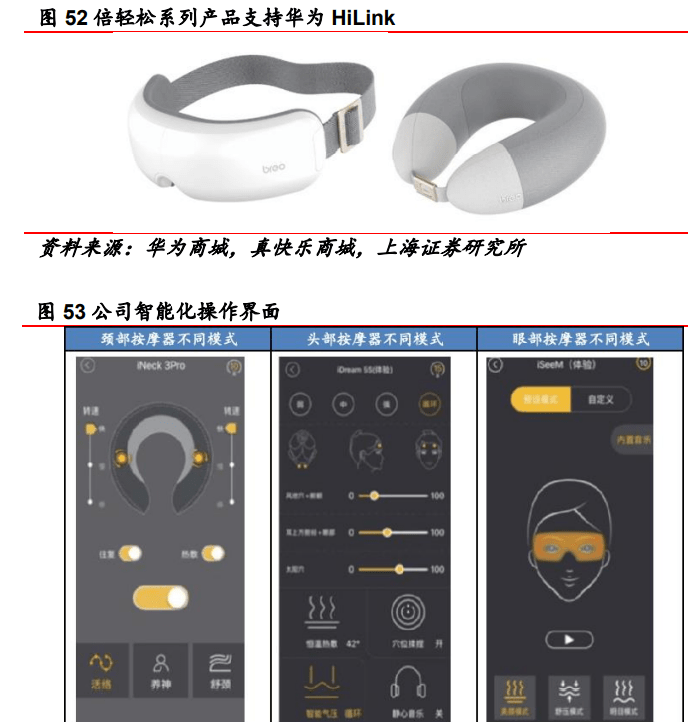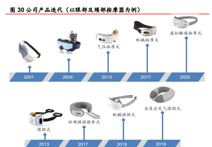 公司以眼部按摩器起家,以眼部护眼仪为例,该产品从公司成立至今进行了 5 次产品迭代,构筑了气压按摩式、机械按摩式及虚拟触感按摩式三大类型。全新一代眼部按摩仪融合智能控制、语音交互、云端社交等功能,深化了客户使用体验。