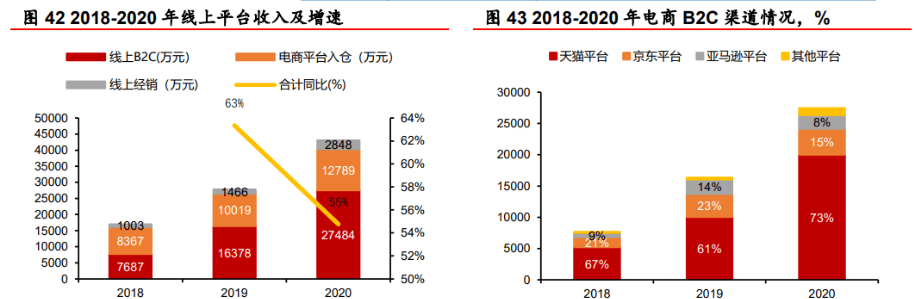 2018-2020年线上 B2C 销售占比高速增长,分别为 45%,59%及64%,CAGR 为 12.46%。