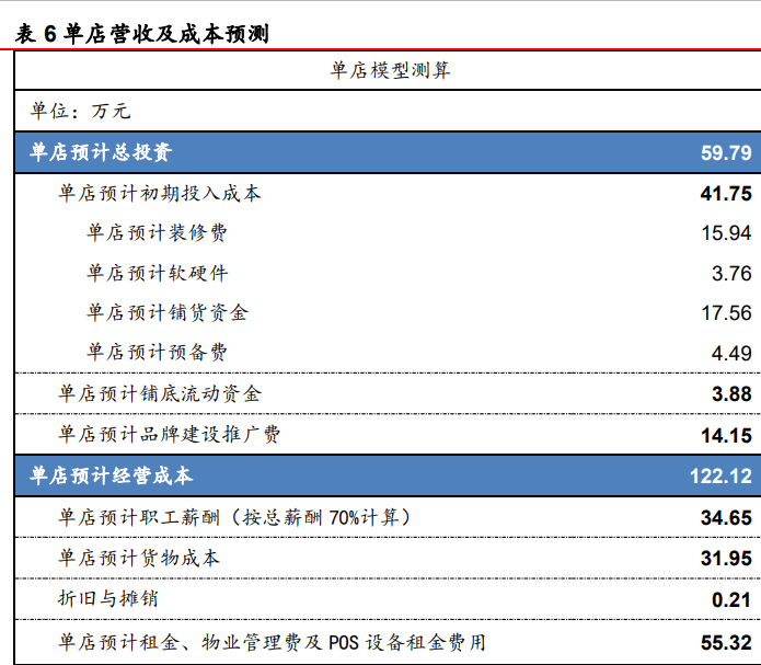 按照单店模型测算:每家店初期总投资成本在59.79万元,经营成本在122.12万元。根据未受疫情影响的2019年数据测算,每家店预计营业收入可达142.11万元,预计三年时间内可达到盈亏平衡。