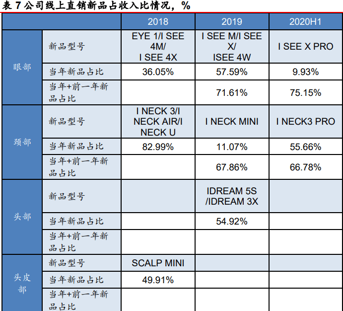 公司以眼部、颈部、头部及头皮为主要产品线,并推出了适用于肩、足、腰等其他身体部位的按摩器经络枪等产品贡献公司营收增量。