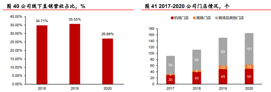 公司2020年线下新直营门店数量较2018年增加了 54 家,主要开设在购物中心,受影响较大的交通枢纽门店增量较少。
