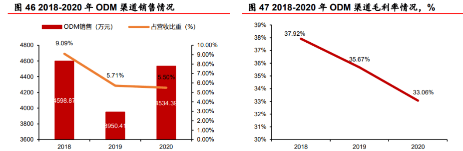 倍轻松公司为傲胜、BORK 等知名企业提供与智能便携按摩器相关的 ODM 定制产品。ODM 业务收入在下游客户销量的带动下快速增长,但从各渠道销售情况来看,ODM 的营收占比已从2018年的 9.1%下降到2020年的 5.5%。