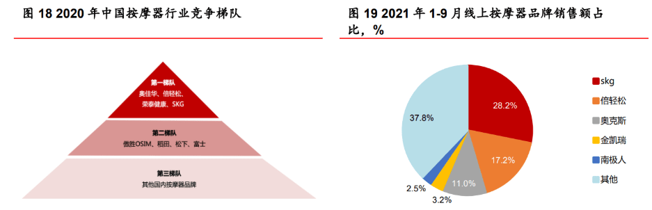 除此之外,按摩器使用感受因人而异,个人对产品需求差异明显。根据倍轻松招股说明书,目前中国按摩器具行业内各类生产企业数量超过 3000 家,而据估计年销售收入超过 1 亿元的规模化生产企业仅 10-20 家,同时国内自主品牌知名度和影响力较低。