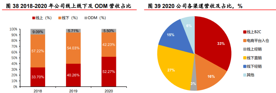 因2020年新冠疫情冲击线下直营门店销售,公司正加速布局线上,2018-2020年公司线上营收占比分别为33.70%,40.26%和52.27%,CAGR为15.76%。