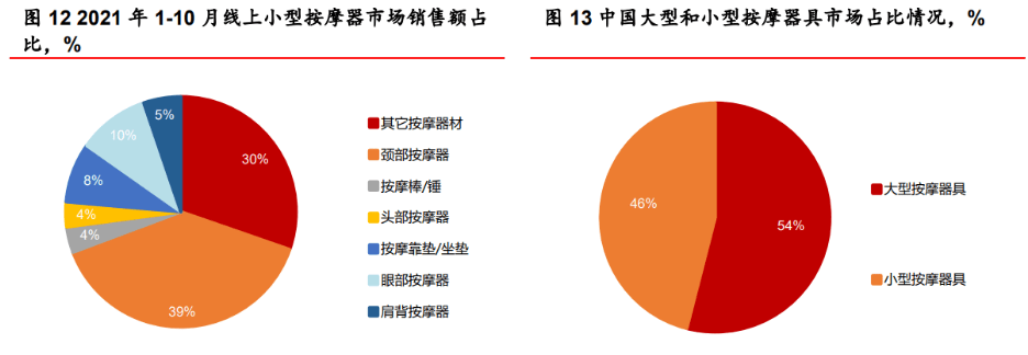 大型按摩器具主要指多功能按摩椅,小型按摩器具产品主要为针对局部的眼部、颈部、头部、头皮、肩部、手部、背部、腰部、足部按摩器等。小型按摩器具有不受空间和时间限制、可选多种挡位的特点,但并非人工按摩的完全平替。