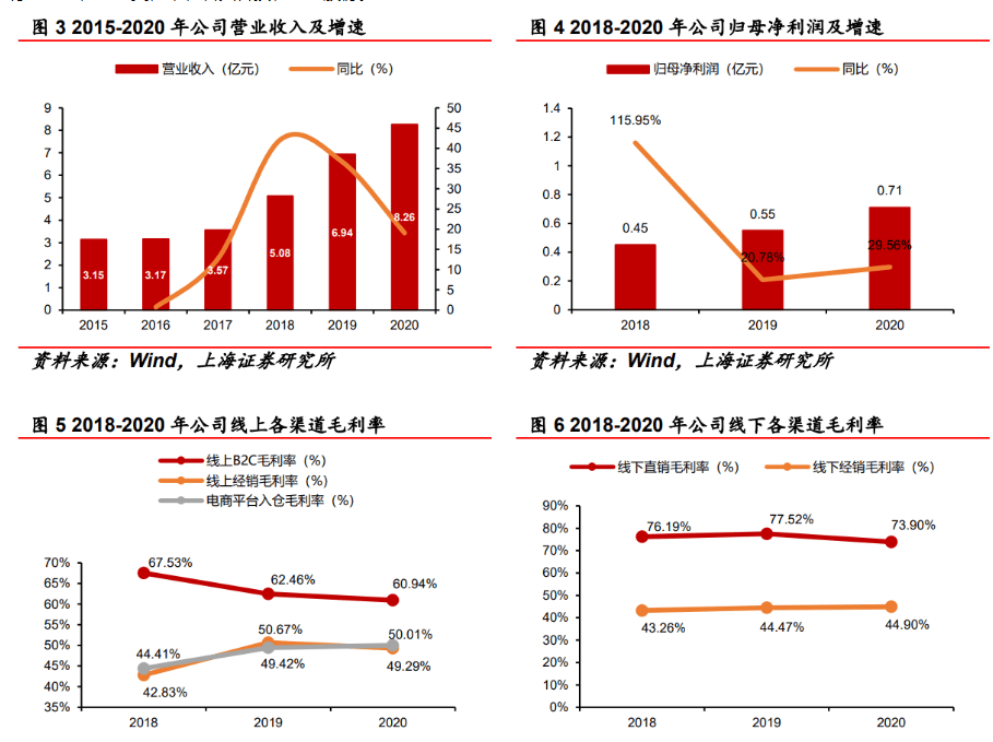 2020年,公司线下直销、经销,及代工毛利率分别为 73.9%、44.9%、33.1%,线上B2C直销、电商平台入仓、线上经销毛利率分为60.9%、50.0%、49.3%,所有销售渠道中公司线下直营毛利率最高。