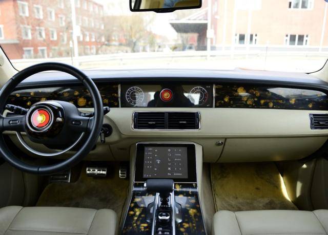 内饰设计造型非常简洁,映入眼帘的只有上下两块液晶显示屏。两侧来自沈氏大漆的装饰板可是我国著名的非文化物质遗产之一,装饰板的样式和内车的配饰都给整车内饰营造出了庄重典雅的氛围。方向盘的造型依旧走的是复古风格,两辐的方向盘造型,下方的金属饰条就是喇叭的操作区域。