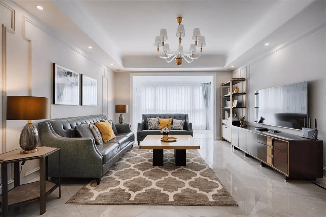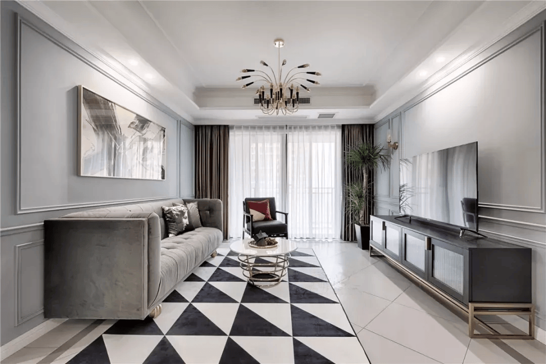 很多屋主也会选择把沙发背景墙和电视背景墙都做上石膏线边框线条,做出对应的造型、相互呼应,这样整体感更强。