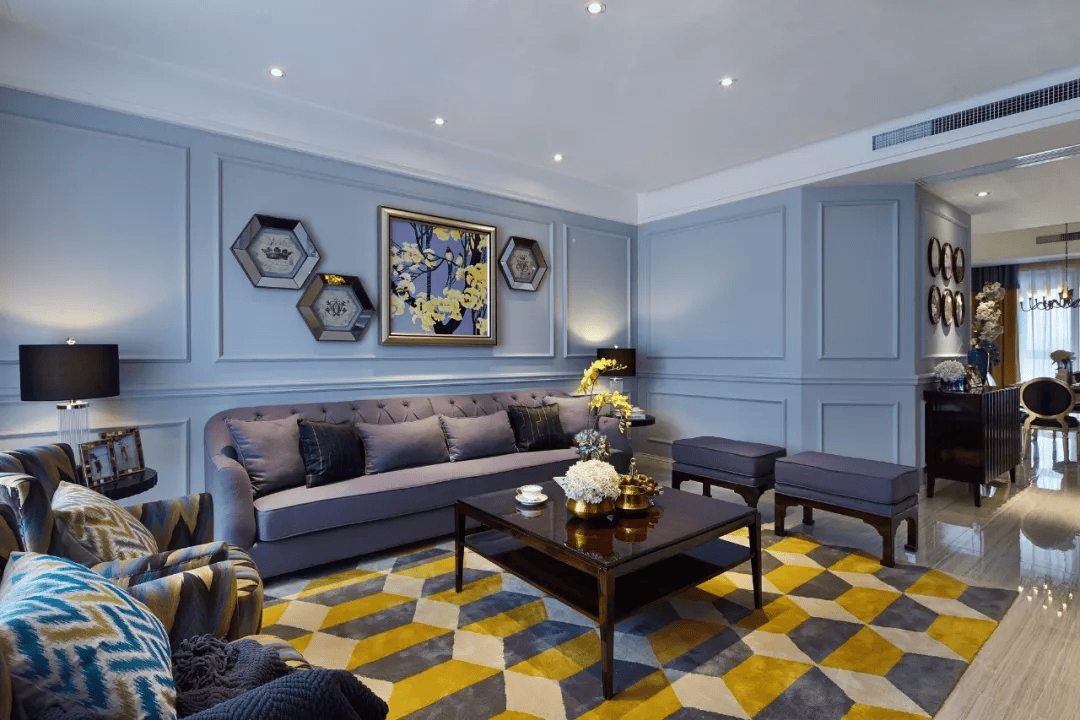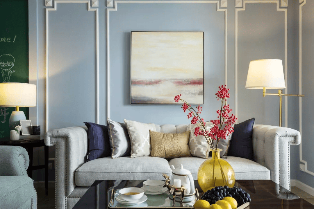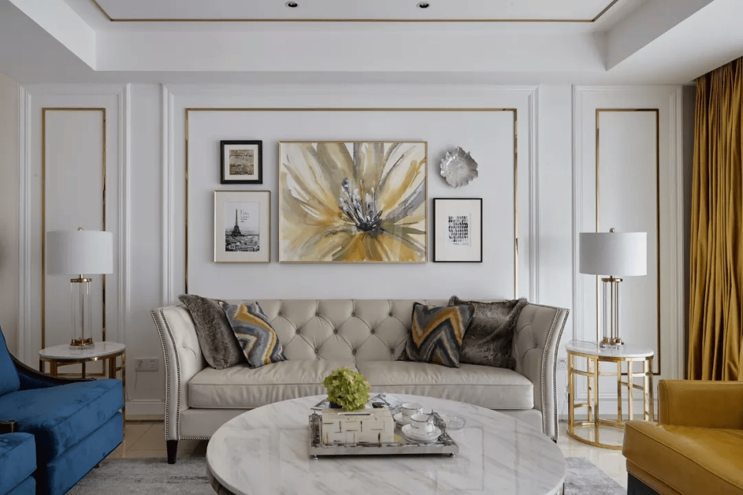 除了电视背景墙,沙发背景墙也是可以用来做上石膏线装饰边框的,简单的石膏线边框线条给客厅带来精致感受,显得更有档次。