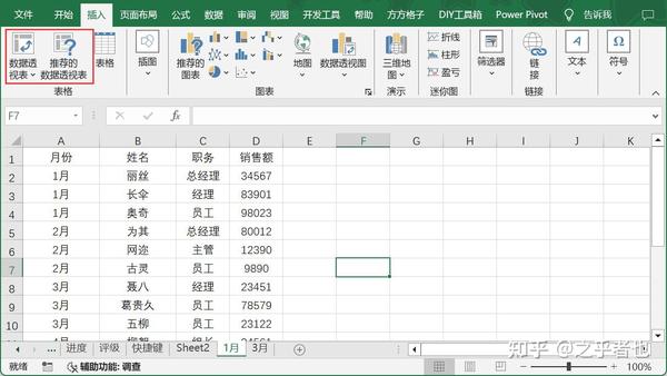 1.2选择【推荐的数据透视表】如果你选择【推荐的数据透视表】,那么我们可以省去拖动的步骤,你可以根据自身需求直接在推荐的数据透视表中选择符合条件的表格:求和、计数、按月筛选等等。
