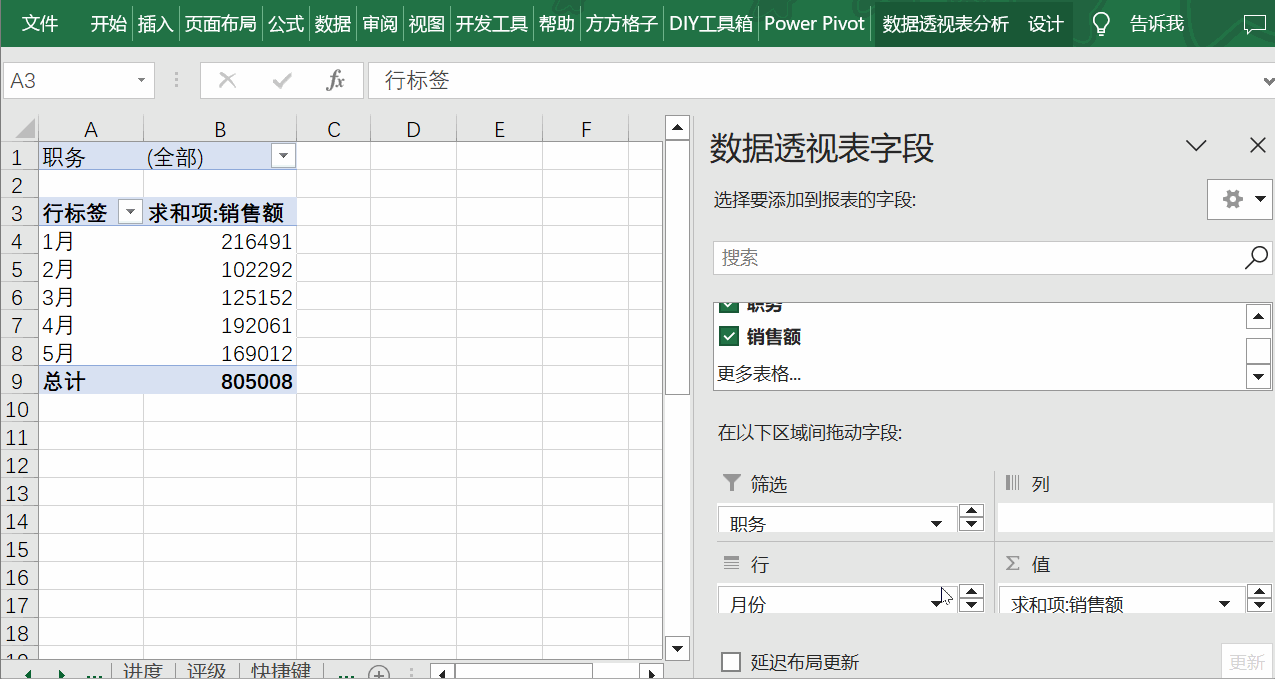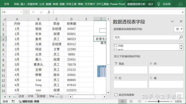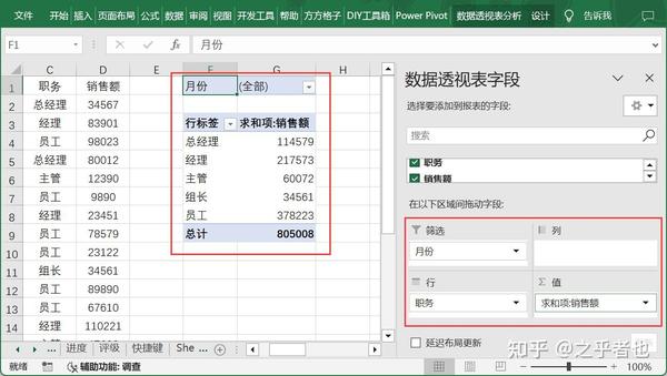 1.1.7可以将【月份】拖动到【筛选】区域,将【职务】拖动到【行】,将【销售额】拖动到【值】就可以了。这样我们就可以得到每一个职务的销售情况。