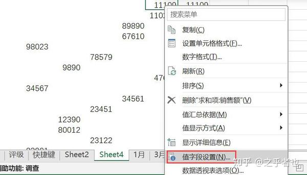 3.1.3基础操作中我们提到过对字段的设置(在字段右侧点击向下箭头选择对应功能进行设置),你也可以用光标选中对应的字段,比如我们想要对【值】进行设置,可以直接在数据透视表区域,选中某一个值,点击右键,选择【值字段设置】,同样可以设置字段。