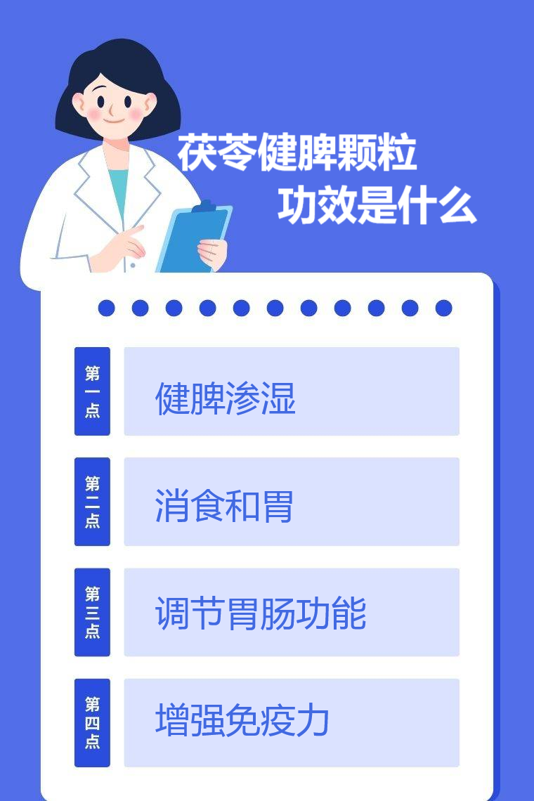 茯苓健脾颗粒是一种中药制剂,具有多种功效,包括健脾渗湿、消食和胃、调节胃肠功能、增强免疫力等。以下是对其功效的详细介绍: