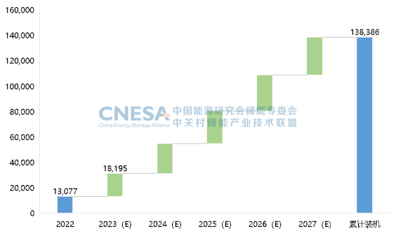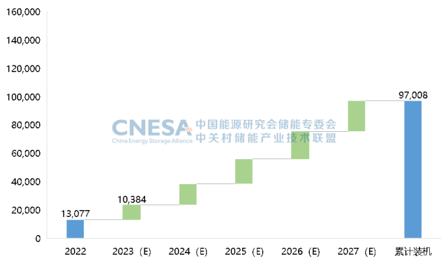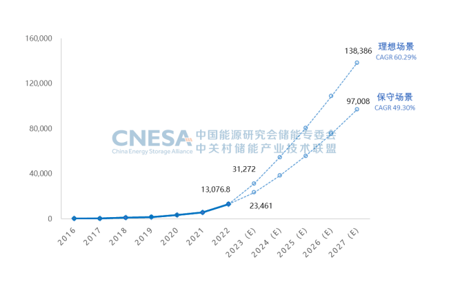 CNESA自 2014年起对中国储能市场规模进行预测,本版白皮书中, CNESA基于保守场景(定义为政策执行、成本下降、技术改进等因素未达预期的情形)和理想场景(定义为各省储能规划目标顺利实现的情形)对 2023-2027年中国新型储能市场的规模和发展趋势进行预测。