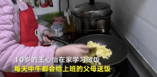 就像图上这个10岁的小姐姐,她的爸爸妈妈都是公交司机,常常没时间做饭,她就自己学做饭,还常常给上班的爸爸妈妈送饭。