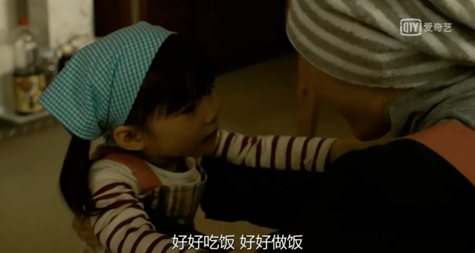 个子还没厨房的台面高的小花,每天戴好头巾穿好围裙,踩在垫高的凳子上,学着自己做饭。