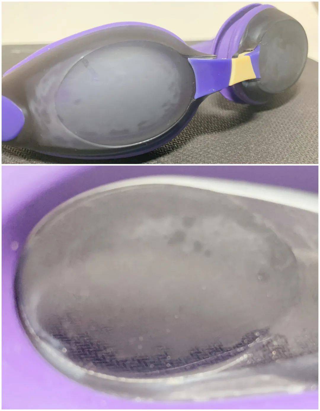 2、笨爸爸还针对一款没有“防雾层”的泳镜,进行了同样的“防雾性测试”。结果显示,此款泳镜的镜片内层,形成了明显的雾气。