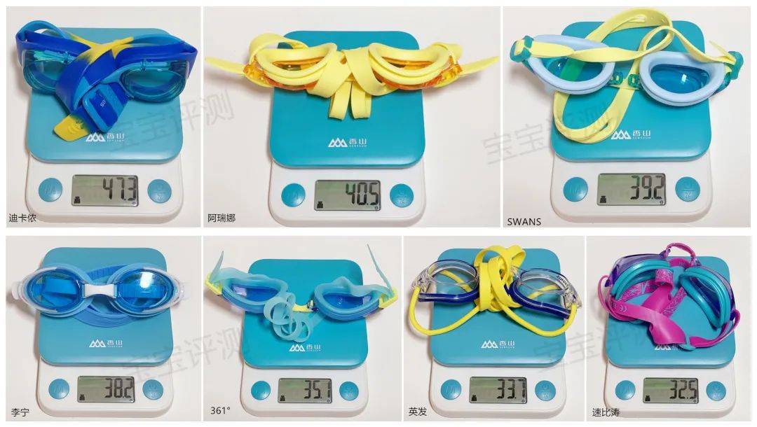 6、7款儿童泳镜的重量在32.5g—47.3g之间,迪卡侬最重,速比涛最轻。
