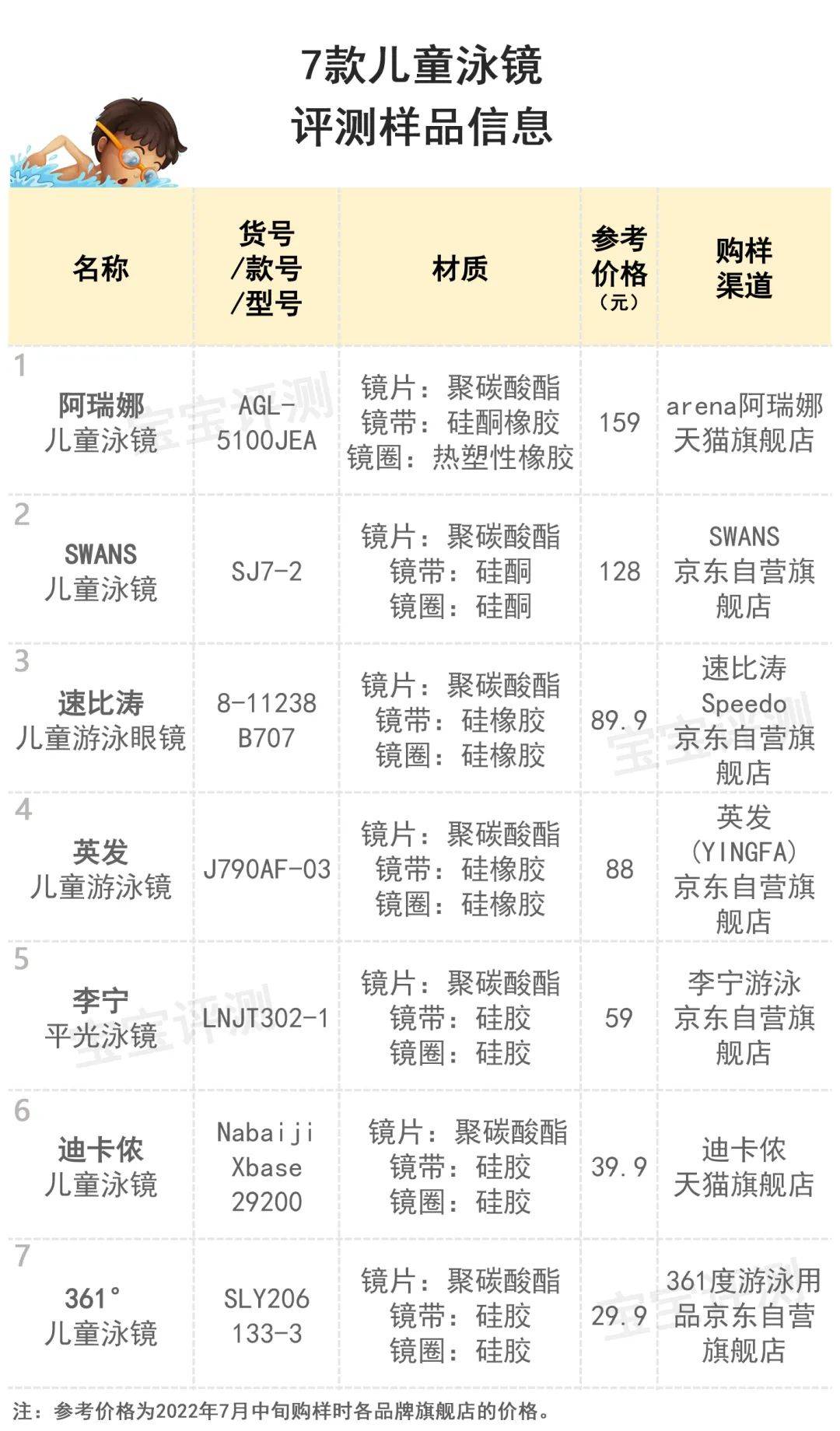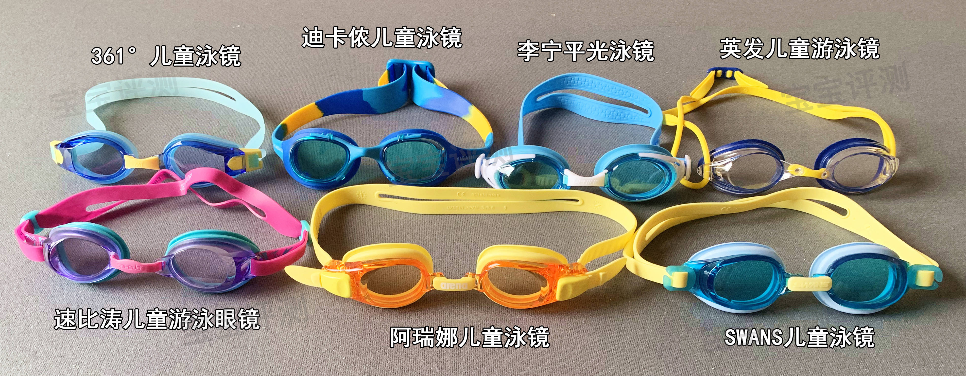 综合电商平台销量、品牌知名度及关注度,本期笨爸爸选择了7款儿童泳镜进行评测,包括:阿瑞娜、SWANS、速比涛、英发、李宁、迪卡侬、361°。