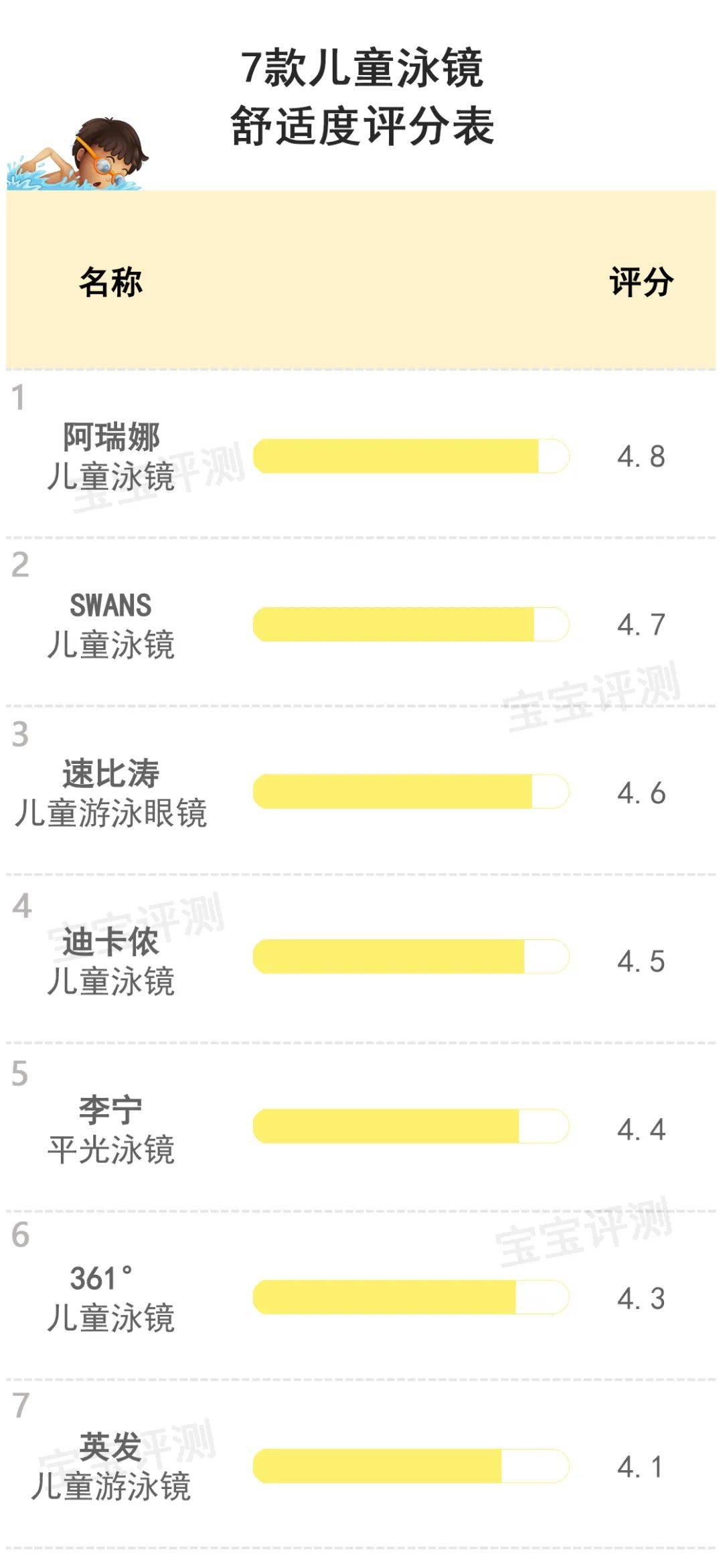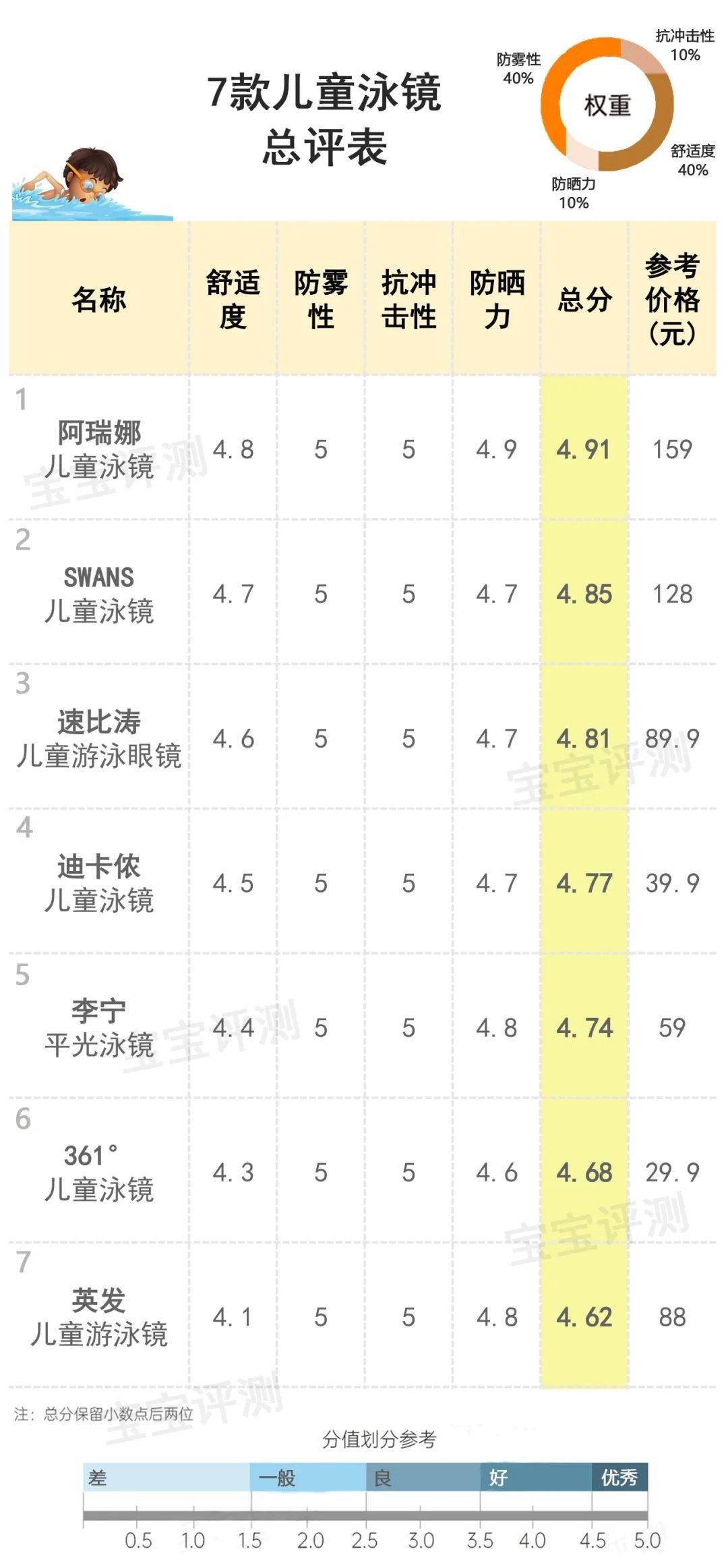 为给大家提供一个相对比较直观的参考,笨爸爸对7款儿童泳镜进行了综合评分及排名: