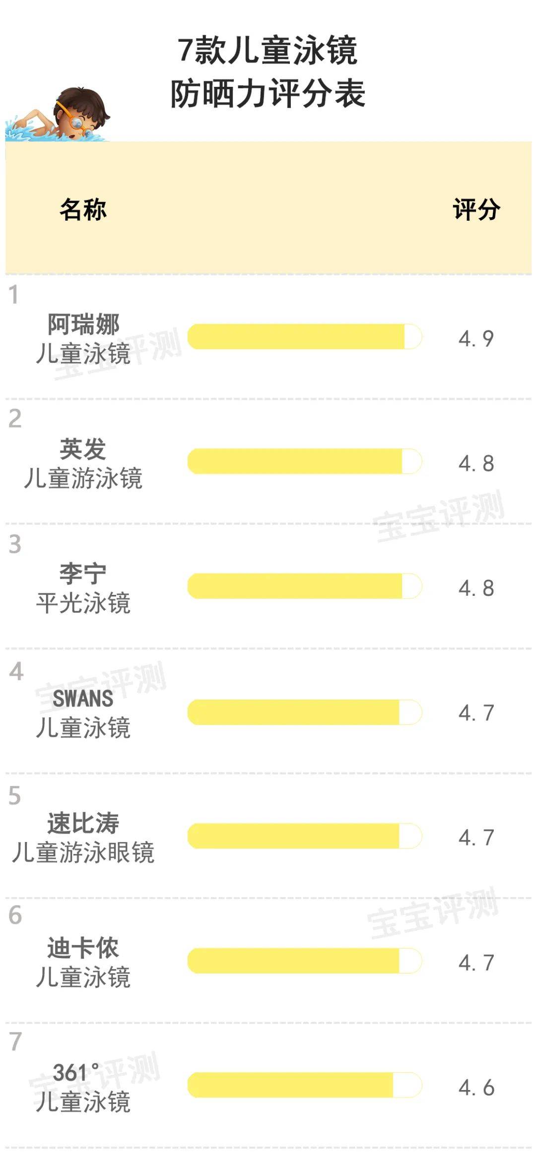 综合以上分析,7款儿童泳镜笨爸爸给出的防晒力评分情况如下:
