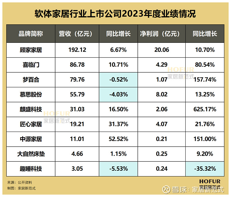 9家里,保持营收、净利双增长的为6家,分别是$顾家家居(SH603816)$ 、$喜临门(SH603008)$ 、麒盛科技、中源家居、匠心家居、大自然床垫。顾家家居以逼近200亿元的营收和超过20亿元的净利润,位居榜首。营收增幅和净利润增幅最大的分别是中源家居和麒盛科技。梦百合仍然紧随喜临门之后。