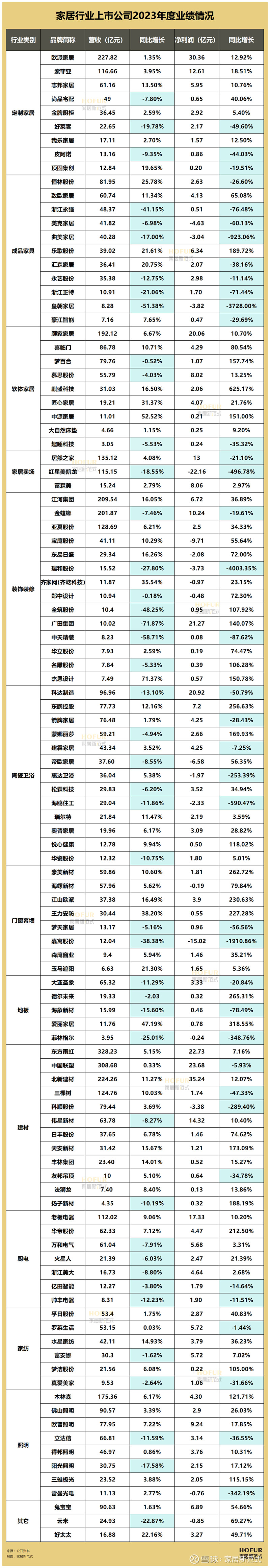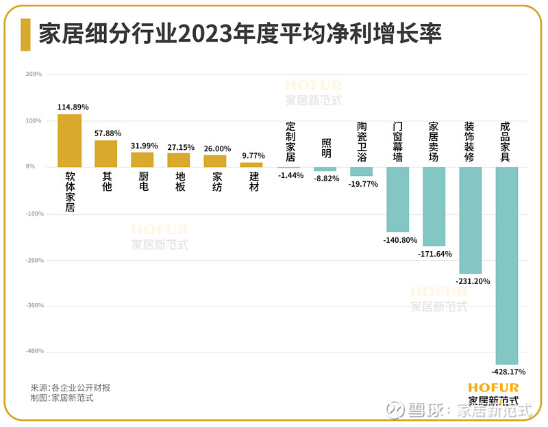从家居新范式统计的表中可知,营收增速为正的行业为6类,其中软体家具、门窗幕墙、建材行业排行平均营收增长率的前三,显示出经历前几年的疫情后,积累的精装硬装以及老旧翻新改造需求在2023年得以一定释放。软体家居行业是唯一一个营收增长超过10%的行业。