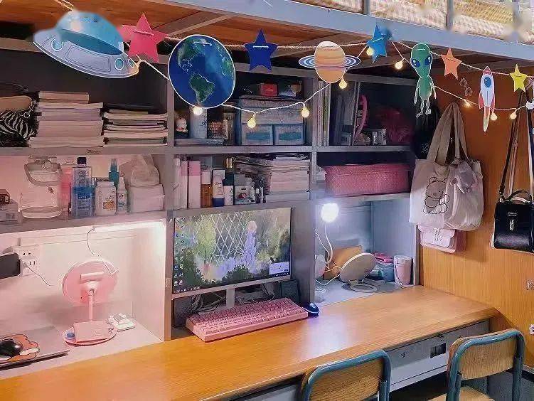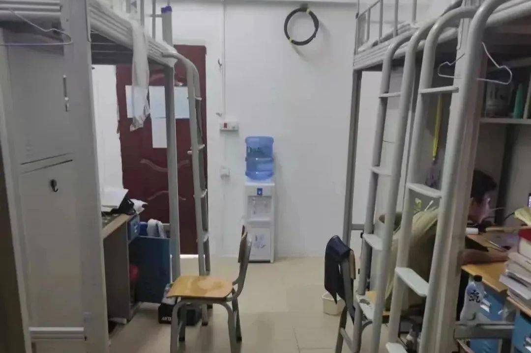 校外的宿舍在校门口附近,离饭堂有点远,一般是4-6人间,有电脑桌和衣柜、独立卫生间和阳台,有热水器,配一台饮水机等。