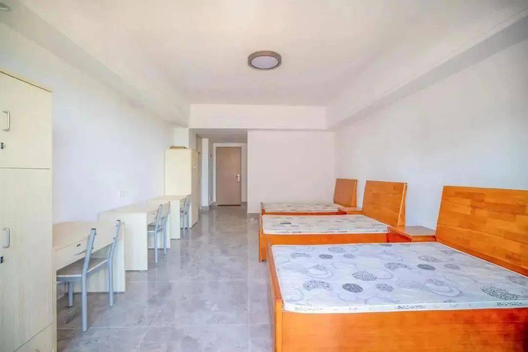 有三人间、四人间、五人间,每个人都有个书桌还有储物柜,独立卫生间,配有热水(热水器或热水管道),没配置有空调。