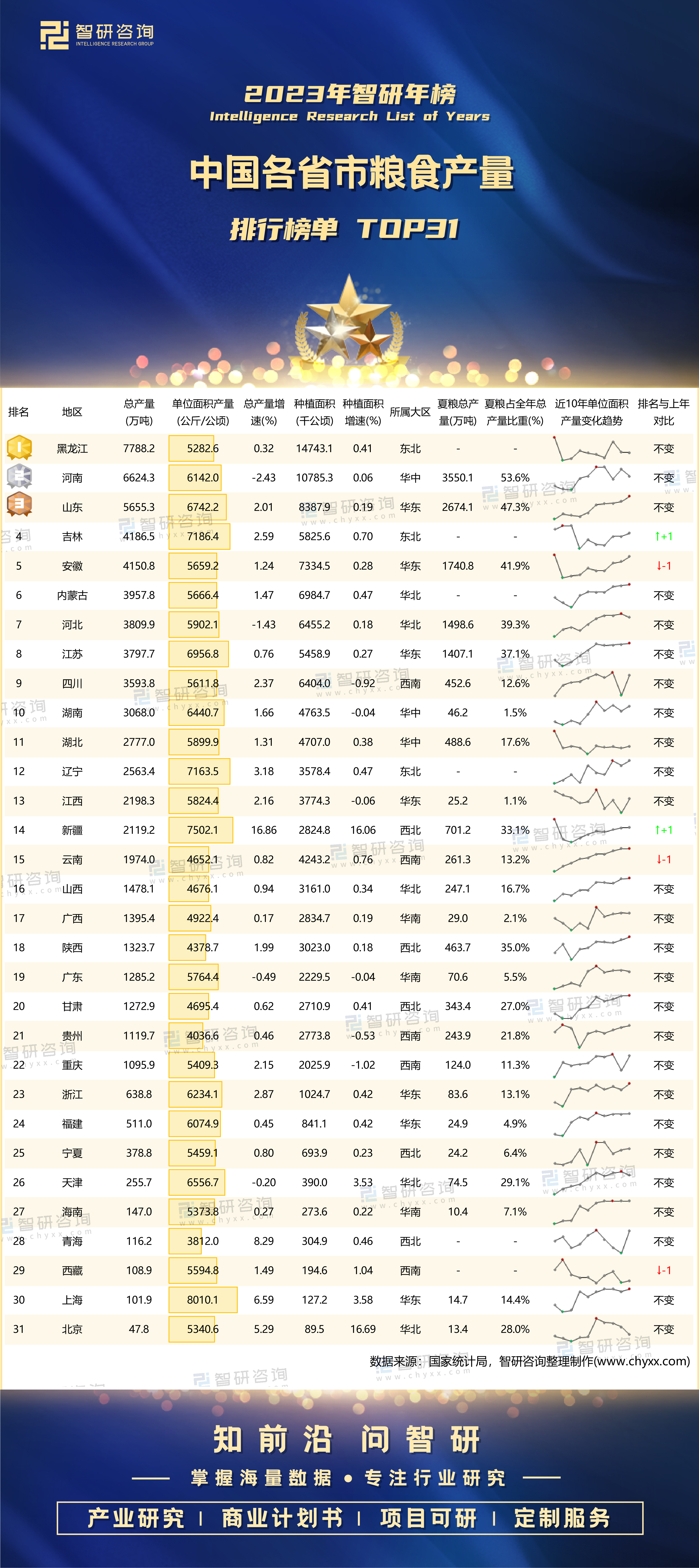 从种植面积来看,黑龙江、河南这2个地区均超过万千公顷,相较于2022年,仅6个地区种植面积有所下滑,其他25个种植面积增长的地区,北京、新疆增幅均超过16%。