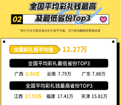 报告显示,近八成人表示其家乡存在彩礼习俗,这一传统习俗在全国范围内依然普遍。《报告》调查显示,2024年全国彩礼钱平均值约为12.27万元,其中广西以6.56万元居彩礼钱排行榜倒数第一,其次是云南和广东。而江西、福建和天津位列全国彩礼钱排行榜前三,其中江西以12.52万元成为我国结婚“最贵”省份,平均彩礼钱超出广西2.67倍。