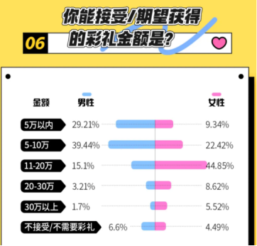 在彩礼的决定权上,超过八成的受访者认同应由双方家庭协商决定,体现了现代婚姻观念中平等与尊重的原则。然而,男女双方在彩礼期望值上却存在巨大差异。男性普遍倾向于5至10万元的彩礼金额,而女性则更倾向于10至20万元。这种差异导致了许多因彩礼谈崩而分手的案例,凸显了彩礼问题在婚姻筹备中的敏感性。