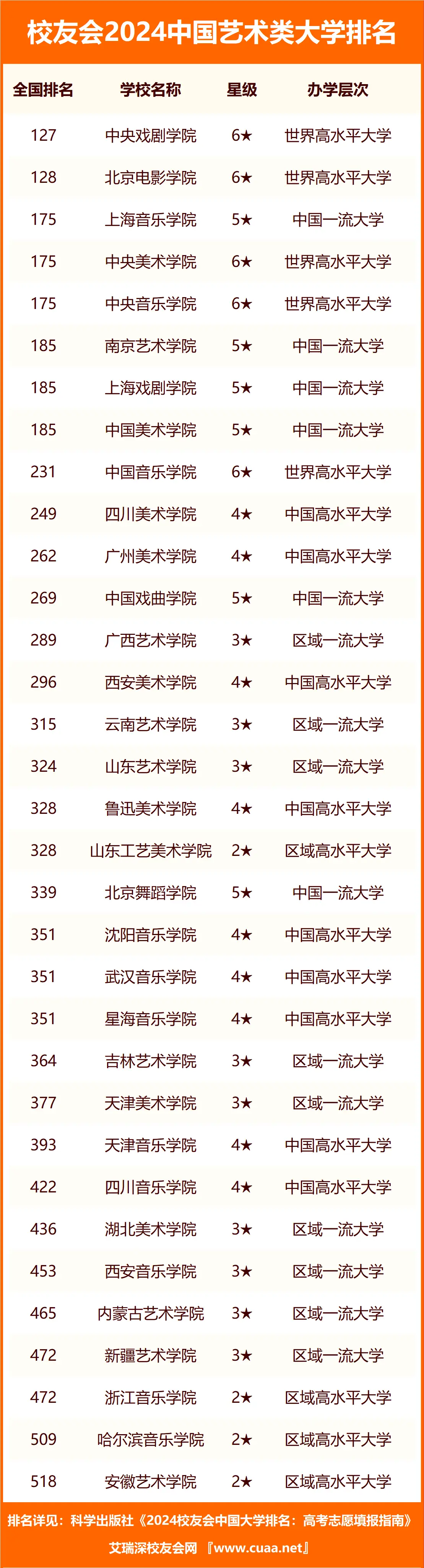 根据校友会2024中国艺术类大学排名,排名从高到低的依次是中央戏剧学院、北京电影学院、上海音乐学院、中央美术学院、中央音乐学院、南京艺术学院、上海戏剧学院、中国美术学院、中国音乐学院、四川美术学院、广州美术学院、中国戏曲学院、广西艺术学院、西安美术学院、云南艺术学院、山东艺术学院、鲁迅美术学院、山东工艺美术学院、北京舞蹈学院、沈阳音乐学院、武汉音乐学院、星海音乐学院、吉林艺术学院、天津美术学院、天津音乐学院、四川音乐学院、湖北美术学院、西安音乐学院、内蒙古艺术学院、新疆艺术学院、浙江音乐学院、哈尔滨音乐学院、安徽艺术学院。