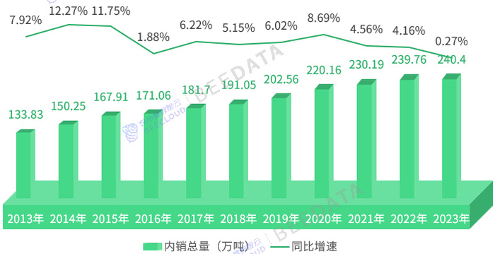 中国茶叶流通协会发布数据显示,2013年至2023年,中国茶叶内销总量增长了106.57万吨、增幅约为79.63%,年均复合增长率约为6.03%。