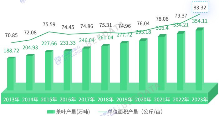 2023年,中国茶叶产量为354.11万吨,与2013年的188.72万吨相比,增长了165.39万吨、增幅约为87.64%,年均复合增长率约为6.5%。