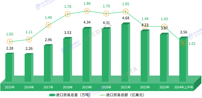 进口金额增长了0.4亿美元、增幅约为37.63%,年均复合增长率约为4.07%,进口金额增速明显低于进口量增速。