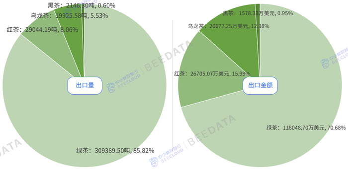 2023年,中国出口的茶叶产品包括绿茶、红茶、青茶(乌龙茶)以及黑茶,其中,绿茶出口规模最大,其出口量及出口金额在全国茶叶出口量及出口金额中所占的比重分别为85.82%、70.68%。
