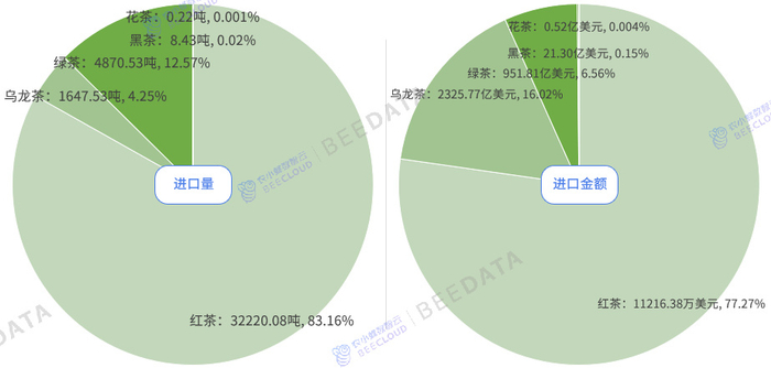 2023年,中国进口的茶叶产品主要有基本茶类红茶、青茶(乌龙茶)、绿茶、黑茶,以及再加工茶叶产品——花茶。其中,红茶的进口规模最大,全国进口的红茶进口量及进口金额在全国茶叶进口量及进口金额中所占的比重分别为83.16%、77.27%。