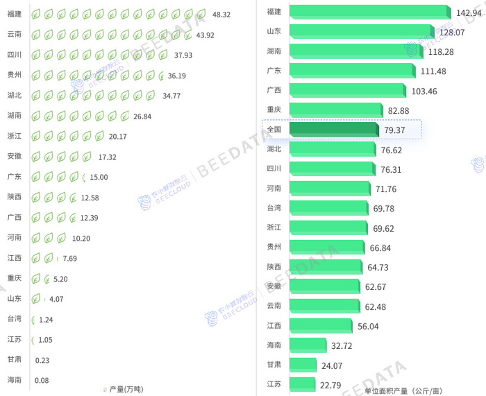 从单位面积产量来看,福建茶叶单位面积产量为142.94公斤/亩,是全国茶叶单位面积产量最高的省域,得益于明显高于全国平均水平的茶叶采摘率以及具有明显优势的单产水平,福建茶叶产量居全国首位。