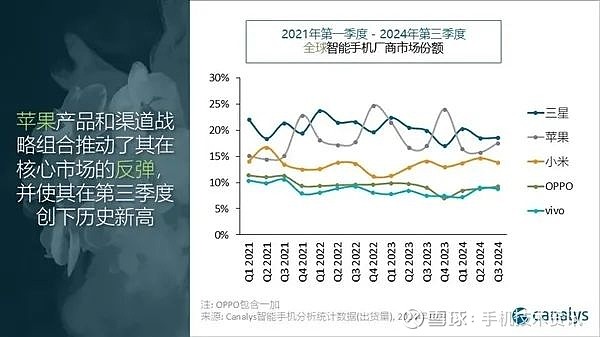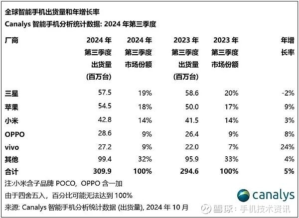调研机构Canalys发布了2024年第三季度全球智能手机市场总出货量数据。