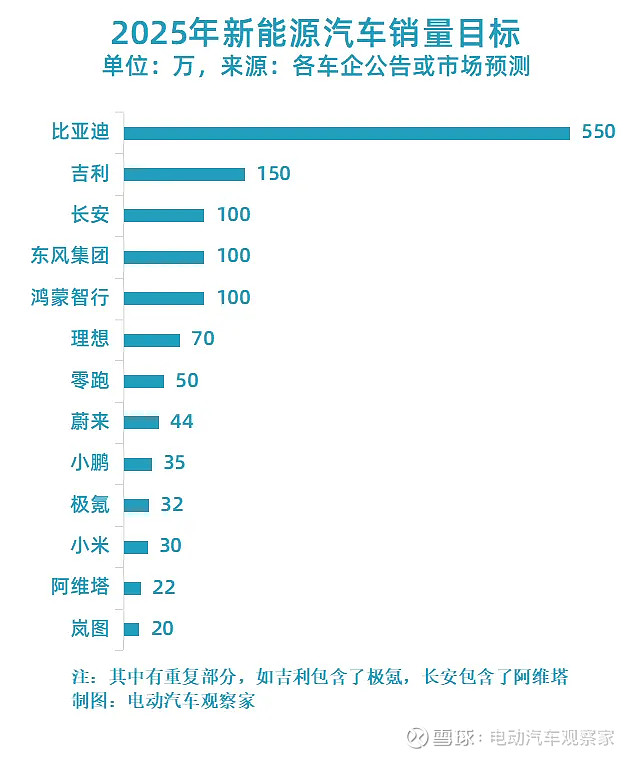 最后我们把已经公布、或者市场有预测的车企2025年新能源汽车销量目标排一下。