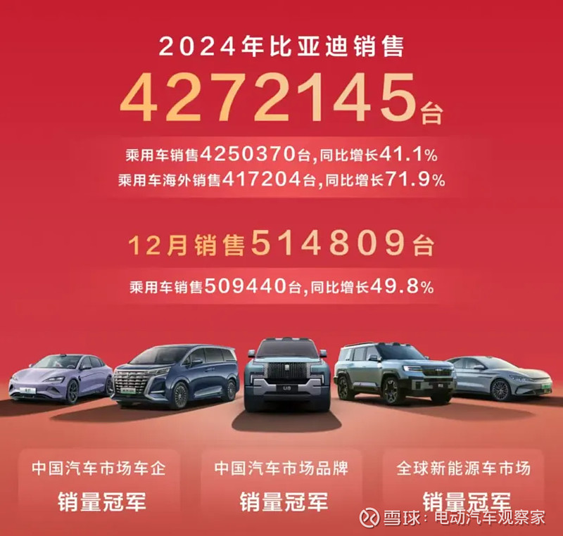 比亚迪在2023年冲上300万辆,增长超过60%;2024年还能以41%的增速增长到427万辆,确实令人佩服。
