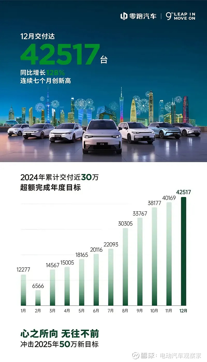零跑汽车在11月时,就提前完成了2024年25万辆的目标,全年29.37万辆,比2023年增长1.03倍,增速笑傲全行业。