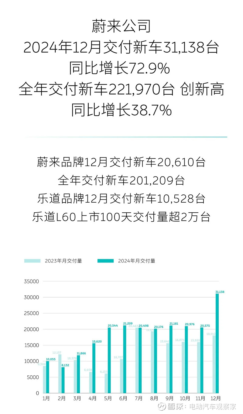 蔚来在最后一个月销量终于大振作,交付突破3万辆,达到3.11万辆,其中蔚来品牌突破2万辆,乐道品牌突破1万辆。