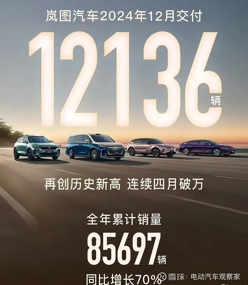 岚图汽车宣布12月交付12136辆,再创历史新高。全年累计销量85697辆,同比增长70%。
