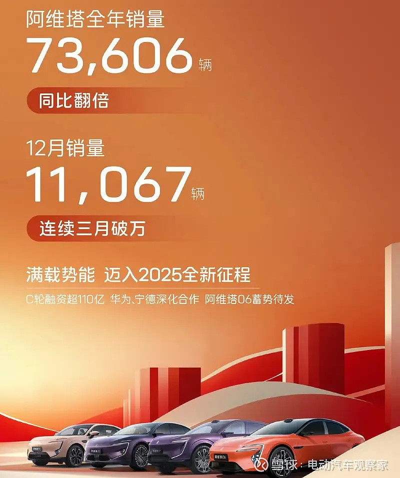 阿维塔宣布,2024年销量73606辆,同比增长140%。其中,12月销量11067辆,连续三个月破万。2025年,阿维塔销量目标22万辆。