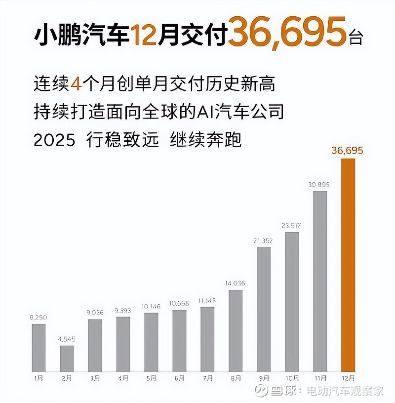 12月小鹏汽车共交付新车3.67万台,同比增长82%,环比增长19%,连续4个月创下单月交付量历史新高。两大爆款小鹏MONA M3交付超1.5万台,小鹏P7+交付量超1万台。