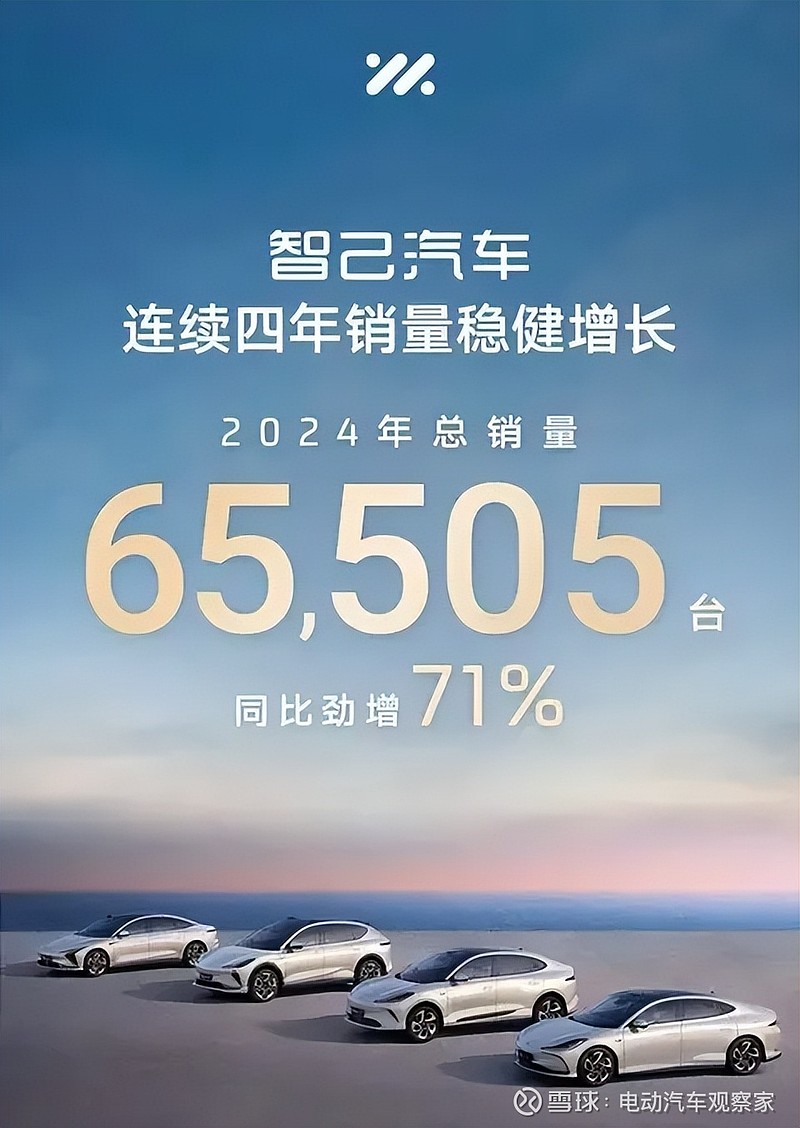 智己 2024年全年累计销售65505辆,虽然比自己的目标12-13万辆差不少,但同比上涨71%,连续四年销量稳健增长。
