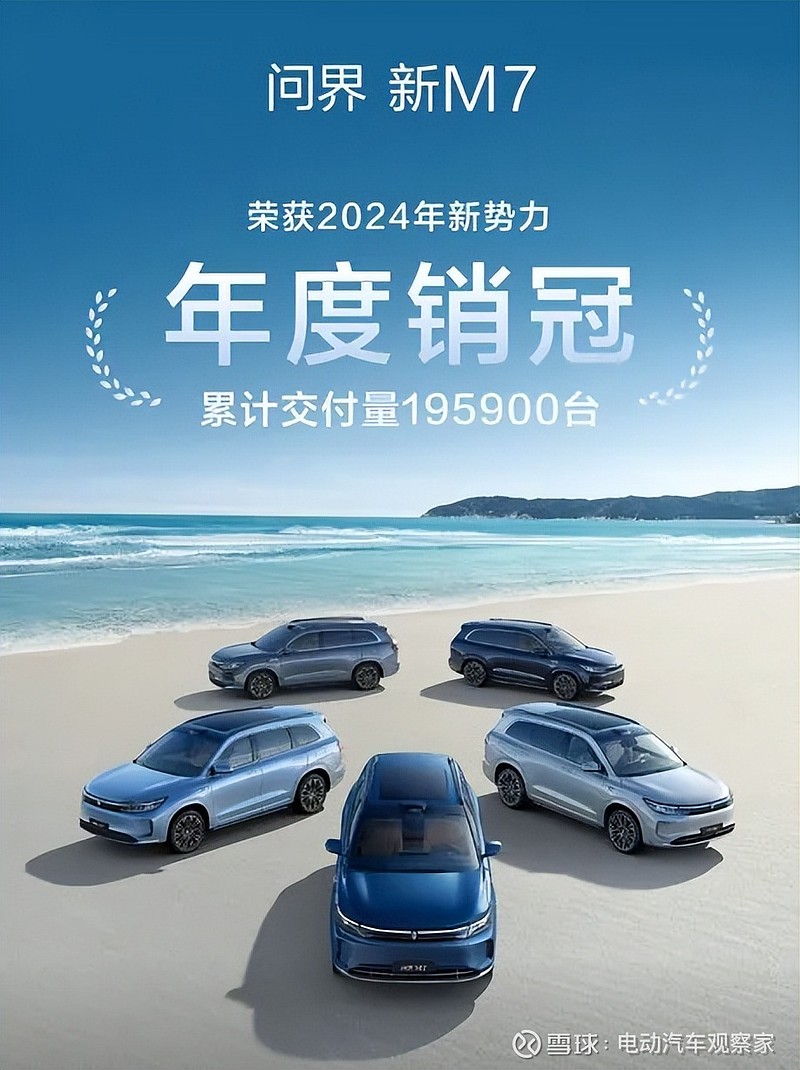 问界品牌当然是占比最大的。其中问界M7是爆款,鸿蒙智行宣布,2024年新势力单车型销冠是问界新M7,销量19.59万辆。问界M9预计超过15万辆。